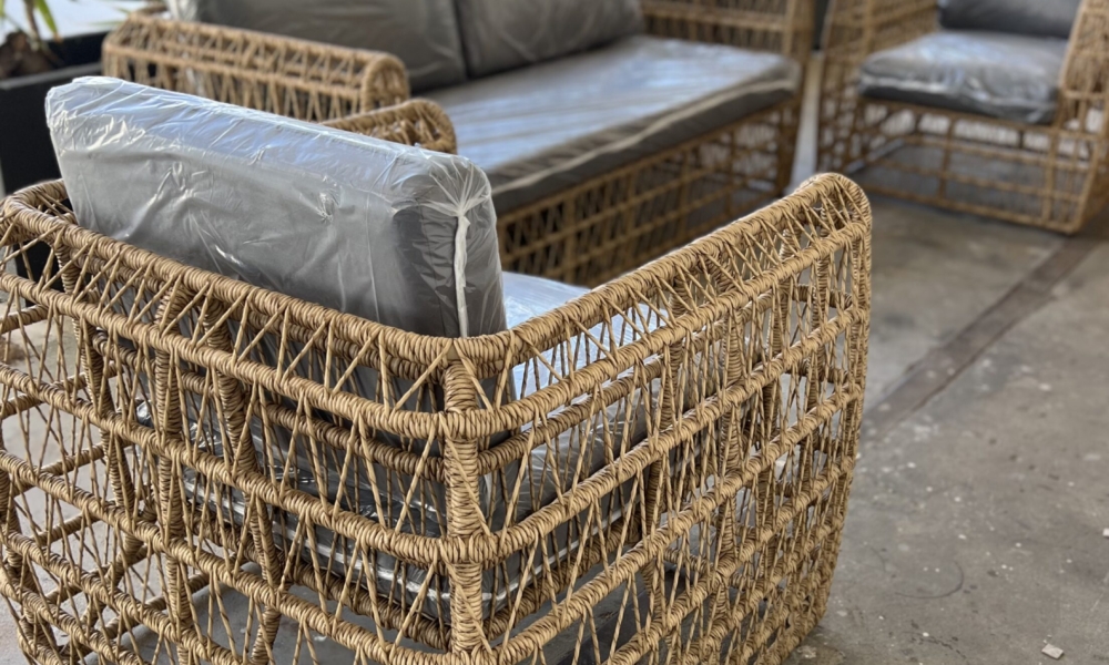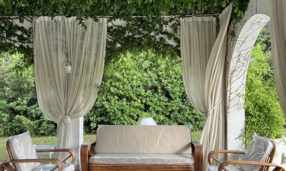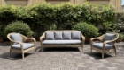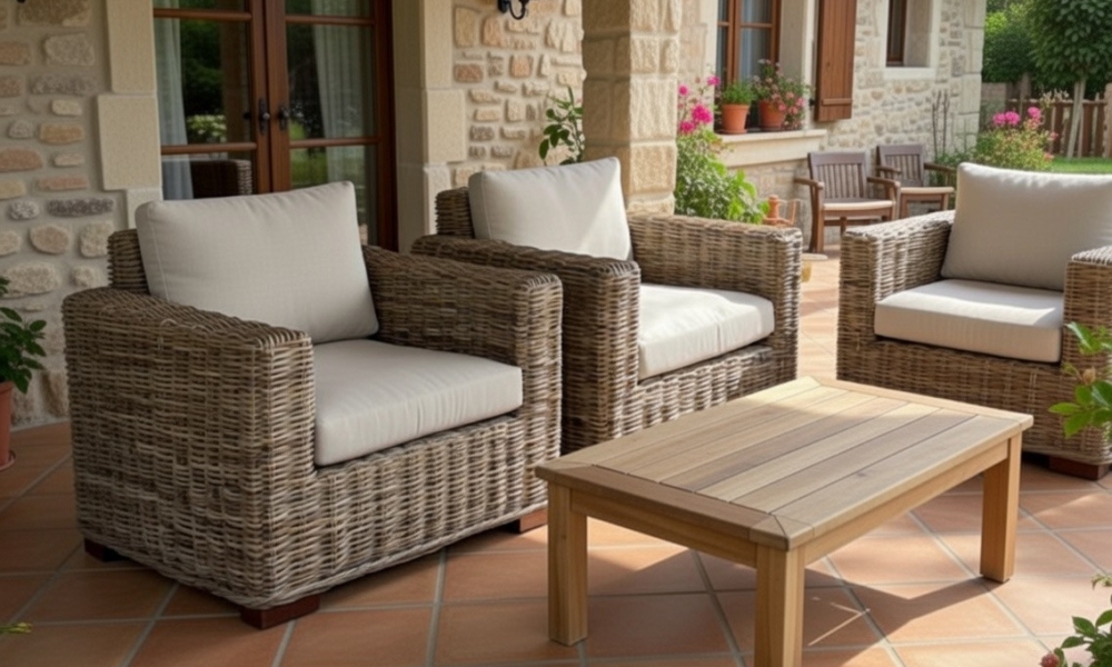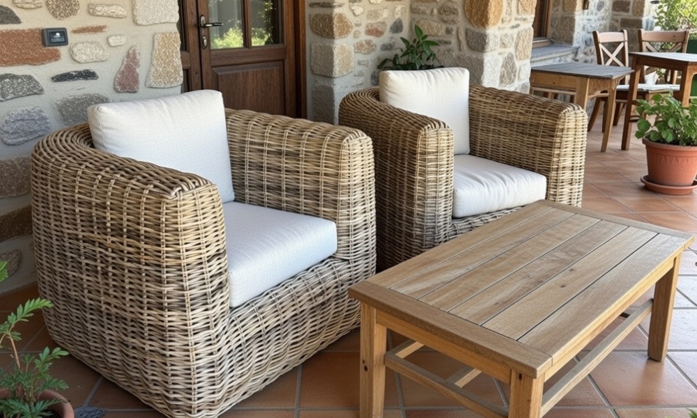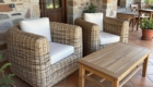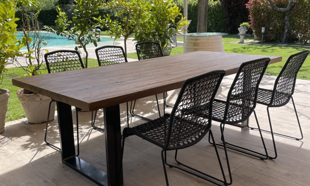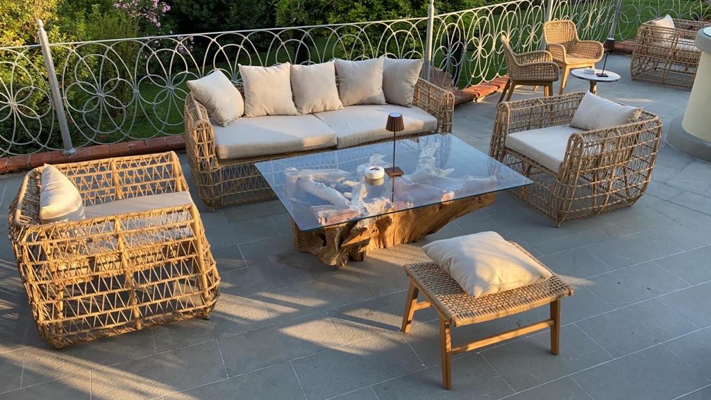 Arredamenti da giardino in alluminio e fibra sintetica resistenti a tutti gli agenti atmosferici. Fibra naturale, rattan, teak per i tavoli e complementi da esterno.